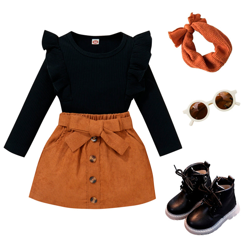 Your little girl will look absolutely adorable in this charming outfit featuring a stylish black ruffled top and a beautiful brown skirt with a cute bow. Perfect for any special occasion or family gathering, this set is made from high-quality materials for comfort and durability. Dress up your little princess in this fashionable outfit and watch her shine!